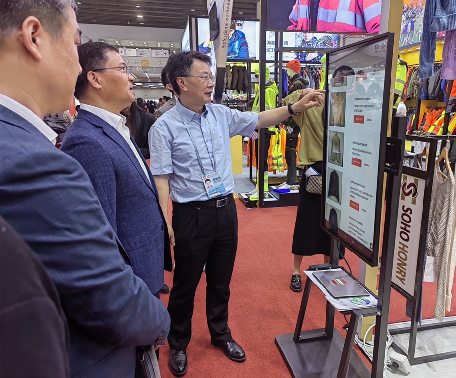 5月1日,第135届广交会第三期开展首日,中国纺织品进出口商会曹甲昌会长一行调研指导苏纺集团男女装品牌展位,苏纺集团党委书记、董事长伍栋陪同调研。